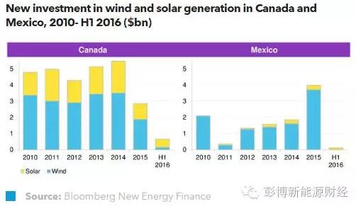 2016年上半年,在經(jīng)過2010到2014年的平穩(wěn)期后,加拿大風(fēng)電和光伏領(lǐng)域的新投資在2015年急劇下降。預(yù)計(jì),2016年的投資額將再次下跌。2015年,墨西哥可再生能源產(chǎn)業(yè)共吸引了創(chuàng)紀(jì)錄的40億美元,展示了相當(dāng)不錯的潛力,但2016年初的投資情況未能繼續(xù)保持良好勢頭。