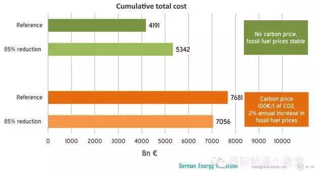 但是,上述的比較有個假設(shè):化石能源價格到2050年保持穩(wěn)定(不再增長),而且不考慮碳價。如果假設(shè)化石能源價格每年上漲2%,碳價達到每噸100歐元,那么不轉(zhuǎn)型的成本就會更高。