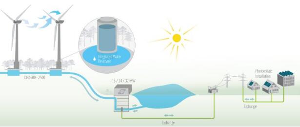 在這座發(fā)電場中,“水”所扮演的角色就像是一個巨大的電池,當風場的環(huán)境處于無風狀態(tài)時,這時,“水”就派上用場了,水會排出以調節(jié)電力輸出,且在不需水力發(fā)電時,會再將水從大蓄水庫“遣送”回風機基座下。透過這種運作模式,“風-水力發(fā)電場”便能持續(xù)產(chǎn)生能量。