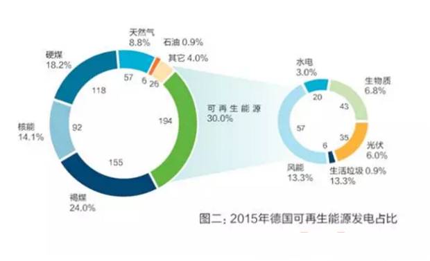 德國能源轉(zhuǎn)型成效卓著,2015年德國年發(fā)電總量達648太瓦時,可再生能源發(fā)電194太瓦時,占發(fā)電總比重的30%。其中尤以風光發(fā)電為主,分別占比13.3%與6%。