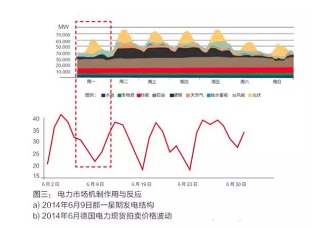 第二個典型案例是2015年3月20日的“日食危機”。德國的光伏裝機量達38吉瓦,超過總發(fā)電裝機容量的20%。日全食將使德國驟然失去約70%的光伏電力,日食結(jié)束時,大量光伏電力又將瞬時涌入,對電網(wǎng)造成巨大沖擊。為應(yīng)對日全食,電網(wǎng)系統(tǒng)運營商在平衡能源市場通過拍賣分別額外購得正負平衡能源3.8吉瓦和2.75吉瓦,平衡能源儲備總共為日食前的1.5倍,同時市場參與者依據(jù)提前預(yù)測作出規(guī)模巨大的需求響應(yīng)?!叭帐澄C”安然度過,檢驗了歐洲電力系統(tǒng)適應(yīng)波動性可再生能源的能力,也驗證了德國電力市場的成功。