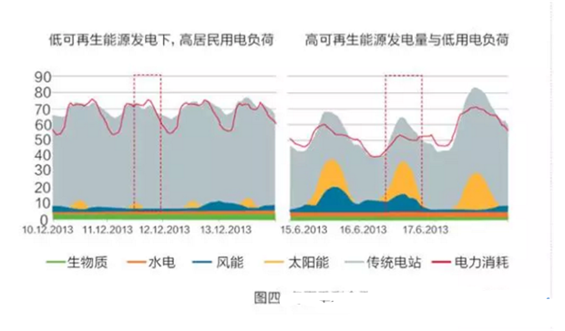 由于政策已制訂了未來可再生能源發(fā)電高比例增長的目標,而目前市場上低邊際成本的風電光伏又能優(yōu)先并網(wǎng)發(fā)電,剩余需求負荷(residualload)于是成為影響電力市場設(shè)計的一個重要概念。它指除去風光發(fā)電外、剩余發(fā)電組合所需承擔的電力需求量。圖四分別給出了冬夏季可再生能源發(fā)電量與剩余需求負荷間的普遍關(guān)系,夏季風光發(fā)電多,需求總量較小,剩余需求負荷小;冬季反之。未來還可能出現(xiàn)兩種極端情況:1.最大剩余需求負荷:用電需求高,同時幾乎不產(chǎn)生風能和太陽能,這可能發(fā)生在一個寒冷無風的冬夜;2.最小剩余需求負荷:電力需求低,但同時產(chǎn)生大量風能和太陽能發(fā)電,這可能發(fā)生在有風和/或陽光明媚的周末或節(jié)假日。