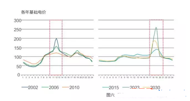 在傳統(tǒng)能源結(jié)構(gòu)下,用電高峰使峰值電價總是出現(xiàn)在每日10:00到14:00點之間,可達日平均電價的1.2至2倍。隨著越來越多風能與太陽能的投入,傳統(tǒng)化石能源逐漸退出發(fā)電市場,電價波動更為頻繁劇烈。模擬結(jié)果顯示,午間時段10:00到14:00間的用電高峰恰也是未來太陽能發(fā)電高峰,隨著光伏的規(guī)模不斷擴大,中午的電力供需矛盾將明顯緩解,這一時段的峰值電價曲線趨于平緩。傍晚時分太陽能發(fā)電大幅減弱直至為零,此時生活用能趨高,而傳統(tǒng)化石能源發(fā)電規(guī)模已經(jīng)削減,傍晚將出現(xiàn)全天的峰值電價。日內(nèi)電價峰值將由過去的雙峰變?yōu)槲磥淼膯畏?。?030年日峰值電價最多可達平均電價的2.5倍以上,同時夜間01:00到06:00點的谷期電價也有抬升:2002和2006年的最低谷期電價僅為日平均電價的二分之一,而從2015年起這一數(shù)字將提高到0.7左右。這樣的價格信息反映了綠色能源結(jié)構(gòu)對未來電力市場的影響。縱向相比圖右2023年傍晚的峰谷價與日平均電價相比分別為2.6與0.7,大約是4倍。而到2030年,峰谷價差明顯縮小,這恰是2.0市場、需求側(cè)管理、儲能等多項因素發(fā)揮作用的結(jié)果。