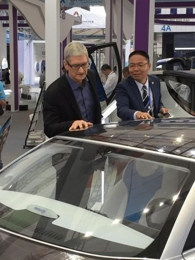 10 月 12 日,庫克在深圳“雙創(chuàng)周”中亮相,并在漢能展臺仔細(xì)琢磨漢能太陽能動力汽車和砷化鎵薄膜發(fā)電技術(shù)。