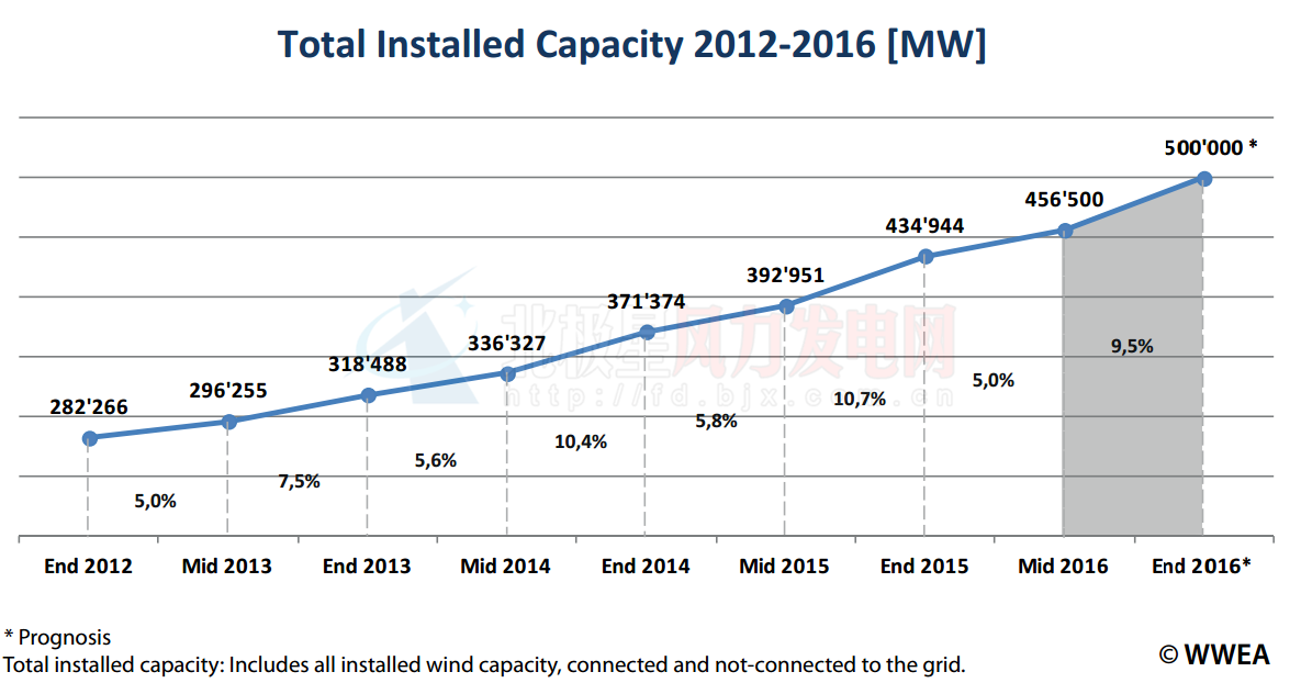 截止2016年6月末,全球風(fēng)電累積裝機(jī)達(dá)456,486MW,新增裝機(jī)同比2015年基本持平達(dá)到21,714MW。截止2016年所有已裝風(fēng)機(jī)產(chǎn)出的電力可以滿足全球4.7%的電力需求。2016年6個(gè)月內(nèi)全球風(fēng)電裝機(jī)增長(zhǎng)了5%。