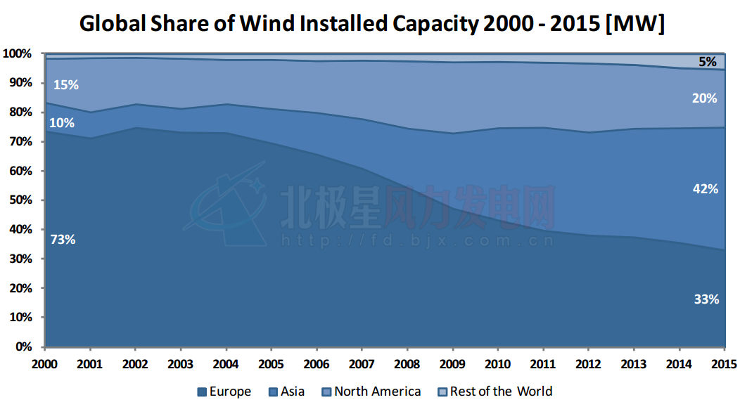 圖三 各地區(qū)風(fēng)電裝機(jī)占全球市場(chǎng)份額2000—2015(MW)
