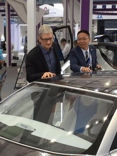 漢能控股高級副總裁張彬(右)向美國蘋果公司CEO庫克介紹漢能全太陽能動力汽車