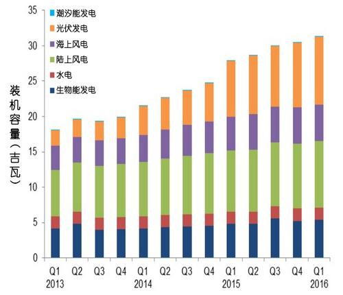 截至2016年第一季度末,英國可再生能源總裝機容量達31.2吉瓦,同比增長12%,環(huán)比增長2.4%。第一季度新增的0.7吉瓦裝機容量中,一半以上來自于光伏發(fā)電。與去年同期相比,光伏發(fā)電裝機容量增長了21%(1.7吉瓦),為9.6吉瓦。