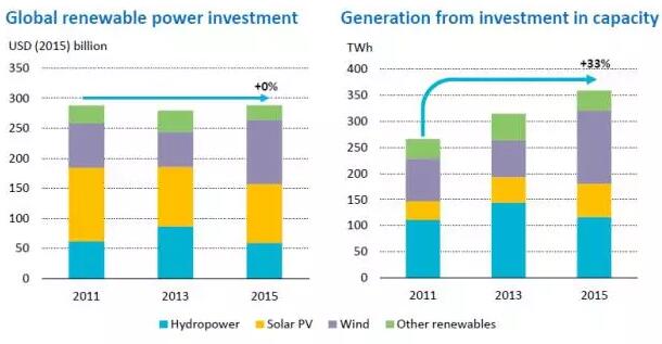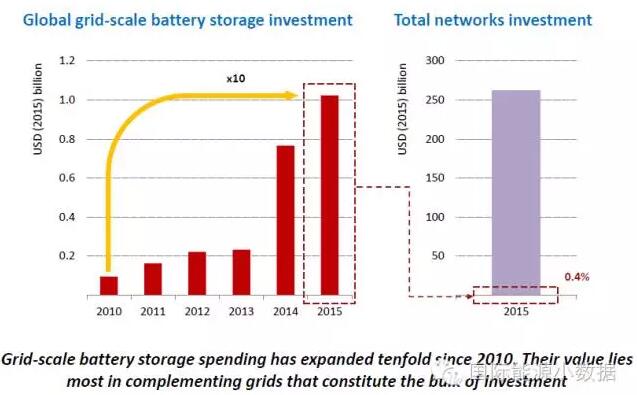 特別值得一提的是,2011年以來全球在可再生能源發(fā)電投資基本平穩(wěn),但是由于可再生能源成本的下降,每年新增的可再生能源發(fā)電量逐年增加,2015年超出2011年33%。此外,電力儲(chǔ)能投資2015年超過100億美元,是2010年的10倍;但是儲(chǔ)能投資僅占電網(wǎng)投資的0.4%,還有很長的路要走。