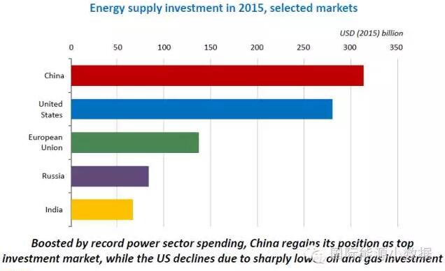 2015年中國能源領(lǐng)域總投資為3150億美元,占全球能源總投資的17%,是世界上第一能源投資大國,遠(yuǎn)超位居第二的美國(2800億美元)。在中國能源投資中,有900億美元用于可再生能源發(fā)電;450億美元用于化石能源電廠(主要是煤電廠,2015年新增煤電裝機(jī)接近45吉瓦)。