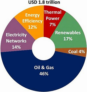 從投資明細(xì)來(lái)看,雖然石油˙天然氣˙煤炭占投資總額的50%,但是算上火力發(fā)電,同比降低6%。可再生能源占投資總額的17%,增加了1%,電網(wǎng)占投資總額的14%,增加2%;節(jié)能相關(guān)的投資增加到12%,同比增加2%。全球能源產(chǎn)業(yè)正向減少二氧化碳排放量,能源轉(zhuǎn)移方向發(fā)展。
