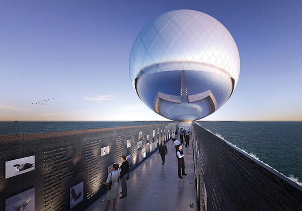 jaesik lim, ahyoung lee, jaeyeol kim和taegu lim參與了clear orb的設(shè)計,使它看上去就像是漂浮在海洋之上。它的上半部分是由半透明的玻璃組成的,折射著周圍的自然景觀,下半部分鏡子般的表面也在陽光中閃閃發(fā)光。從圣莫妮卡海灘有道路直接連接著該裝置,而且是水下通道,這條“沉思之路”的外墻扮演著波浪發(fā)電裝置的功能,跟原有的防波堤在一起,它的內(nèi)部陳列著一系列瀕臨滅絕的動物,讓人們在通過的時候不禁思考,人類應該如何跟自然和諧共處。