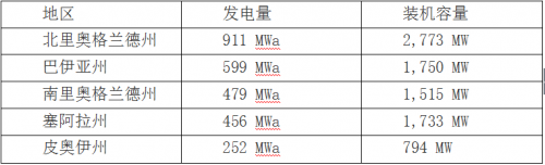 中國(guó)儲(chǔ)能網(wǎng)訊:2016年上半年巴西風(fēng)電發(fā)電量達(dá)到9330MW,年增長(zhǎng)率為55%。北里奧格蘭德州風(fēng)電裝機(jī)量以及發(fā)電量都是最高的,風(fēng)電發(fā)電量達(dá)到了911MW,增長(zhǎng)了40%。巴西各個(gè)州風(fēng)電裝機(jī)容量及發(fā)電量詳情見(jiàn)下表: