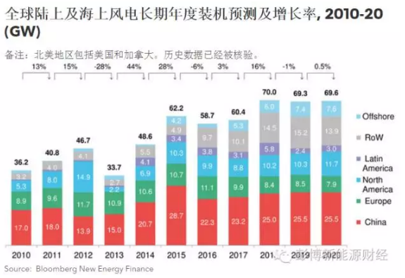 中長期陸上風(fēng)電預(yù)測:主要由于美國市場的需求增長,全球裝機(jī)量預(yù)計(jì)在2018年之后有所增高。 中東和亞撒哈拉地區(qū)的增量可以彌補(bǔ)歐洲市場的低迷。我們預(yù)計(jì)中國的十三五規(guī)劃對(duì)裝機(jī)目標(biāo)不會(huì)有大幅提高。