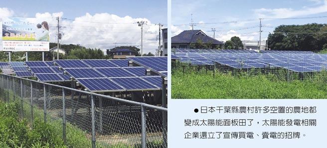 日本千葉縣農(nóng)村許多空置的農(nóng)地都變成太陽(yáng)能面板田了,太陽(yáng)能發(fā)電相關(guān)企業(yè)還立了宣傳買(mǎi)電、賣(mài)電的招牌。圖╱黃菁菁