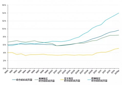 表5:1990~2015年經(jīng)合組織成員國各地區(qū)在可再生能源電力生產(chǎn)中的占比