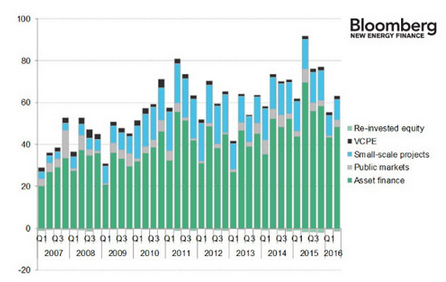 2016年第二季度的清潔能源相關(guān)投資為615億美元,比第一季度增長了約12%,但與極為堅挺的上年同期相比則減少了32%。