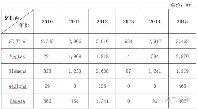 2015年世界前五大整機商在美國的裝機容量如下表所示:
