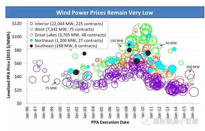 2009年風(fēng)電的上網(wǎng)電價還在7美分/千瓦時,而最近竣工的美國風(fēng)電項(xiàng)目的上網(wǎng)電價合同低至2美分/千瓦時,已成為成為成本最低的電源。