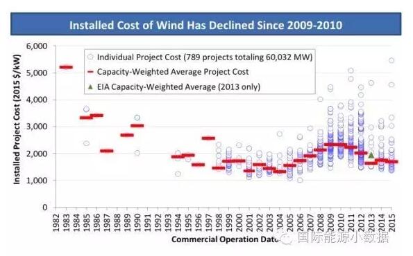 美國陸上風(fēng)電成本創(chuàng)歷史新低,2015年風(fēng)電平均裝機(jī)成本1690美元/千瓦,比2010年前后的高點(diǎn)下降了640美元/千瓦。