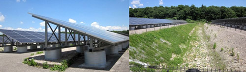 采用承臺基礎(chǔ)減輕了地面高低差對設(shè)置角的影響(左),利用滲透池防止雨水流出(右)
