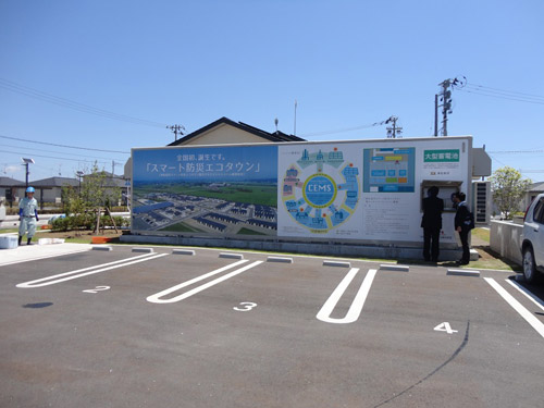 在東松島市柳之目北地區(qū)建設(shè)了85戶市營(yíng)災(zāi)害公營(yíng)住宅。生態(tài)城設(shè)置了光伏發(fā)電設(shè)備(470kW)、定置式鉛蓄電池(480kWh)以及應(yīng)急生物柴油發(fā)電機(jī)(500kVA,圖2、圖3)。即使供電網(wǎng)東北電力停電,也能維持?jǐn)?shù)日正常水平的供電。
