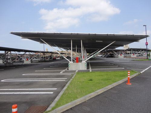兼作車(chē)棚的架臺(tái)系統(tǒng)由歐力士提供。是以德國(guó)旭樂(lè)德(Schletter)的產(chǎn)品為原型,由豐田通商的子公司豐通設(shè)施(名古屋市)等面向日本作了改良。