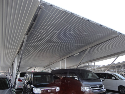 該產(chǎn)品的特點(diǎn)是,采用僅以單側(cè)支柱支撐棚頂?shù)摹皢蝹?cè)支撐”方式,開(kāi)口部沒(méi)有輔助支柱,方便車(chē)輛進(jìn)出。不過(guò),基礎(chǔ)和支柱的負(fù)載因此而變大。