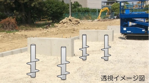 圖7:基礎(chǔ)施工方法示意圖。以4m深度埋入兩根螺旋樁(出處:豐通設(shè)施)