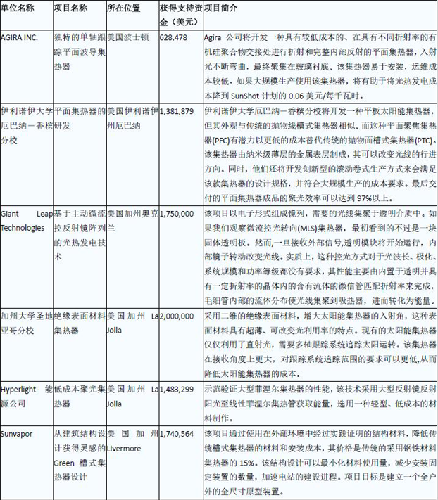 下表為6個獲得資金支持的光熱研發(fā)項目的簡單介紹【因技術(shù)含量過高,以下翻譯僅供參考】: