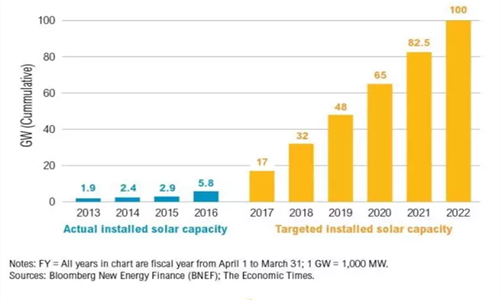 眾所周知,印度是全球用電緊張最嚴(yán)重的國(guó)家之一。早在2014年,印度總理莫迪公布了太陽(yáng)能振興計(jì)劃:到2022年,印度要實(shí)現(xiàn)100GW的太陽(yáng)能裝機(jī)容量,總投資額約8000-10000億元。鑒于印度目前現(xiàn)有光伏裝機(jī)量不到6GW,100GW的目標(biāo)可謂雄心勃勃,來(lái)看一下印度政府描繪的路線圖: