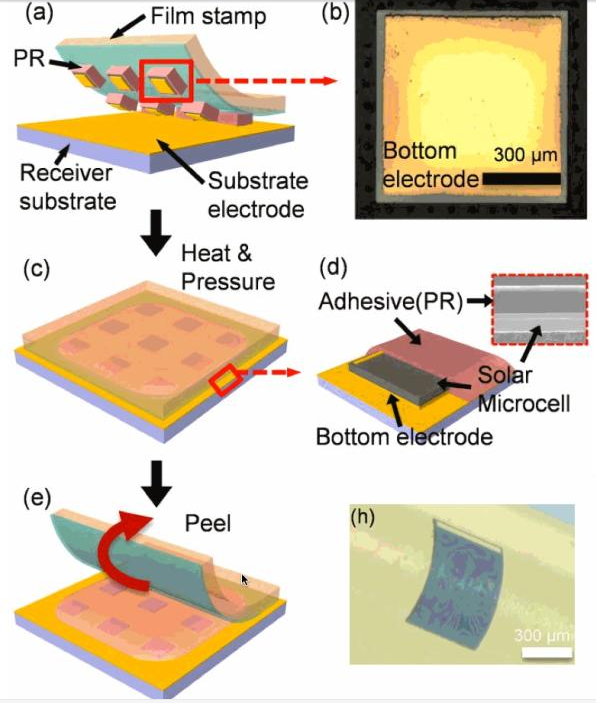 研究中制作太陽能微電池的材料是半導體砷化鎵,主要利用轉印transfer-printing這一技術,電池的重復使用是通過基板底部的電極反射光子回光伏電池來實現(xiàn)的。