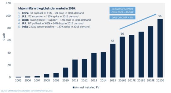 GTM預(yù)計,2016年,全球新增太陽能裝機容量有望增長21%至66吉瓦,比2015年增幅增加11吉瓦,但是,由于中國、日本和英國等國家的政策變化使得2017年增幅將明顯下降。