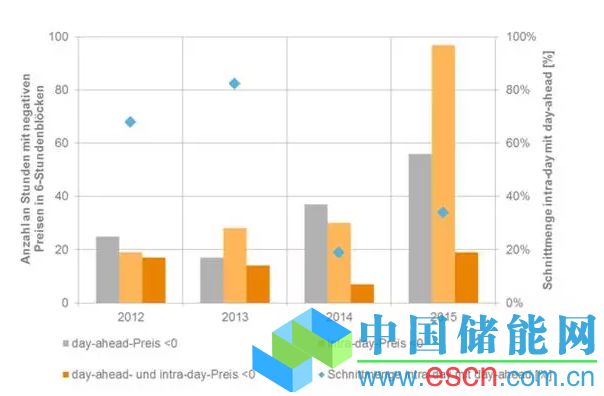 《德國可再生能源法案》(2014年版)第24條并未對負(fù)電價作出明確規(guī)定。幾乎所有市場參與者都認(rèn)定,以日前市場為負(fù)為準(zhǔn),大多數(shù)研究也是基于這個假設(shè)。就在2015年年末,政府在修訂案中提出:2016年日前市場和當(dāng)天市場必須同時在連續(xù)6小時內(nèi)呈負(fù)電價,才終止市場紅利。下圖將展示過去日前價格和當(dāng)日價格,從圖中可以看出將會帶來哪些新的風(fēng)險(xiǎn),幸運(yùn)的是,風(fēng)險(xiǎn)并不大。