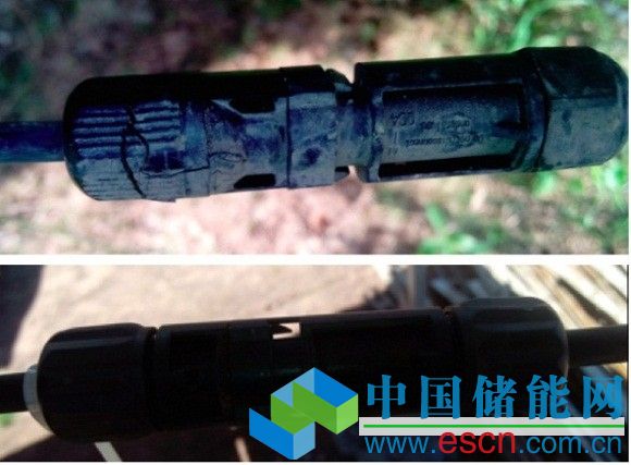 圖一是筆者在南方電站現(xiàn)場一個安裝僅不到一年的電站現(xiàn)場看到的不同連接器的連接情況,左邊是EPC商連接整排電池板自購的廉價連接器,已經明顯裂開,右邊為組件廠家選用的國內知名連接器只是沾染灰塵,整體依然完好正常。但這樣的不匹配連接依然會給電站的打火,甚至起火造成巨大的隱患。
