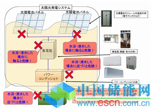 JPEA稱,遭遇水災受損的太陽能電池板可能會出現(xiàn)絕緣不良等故障。接觸的話有觸電危險。