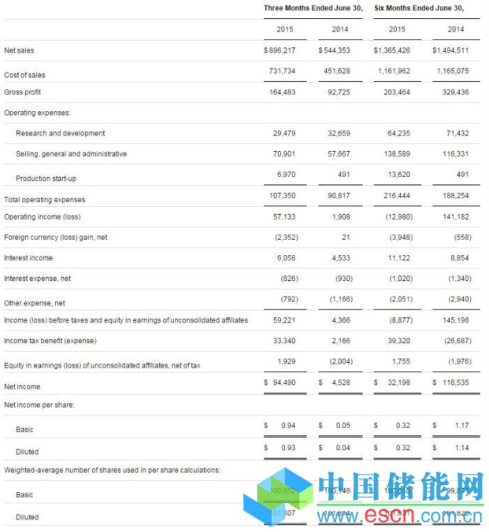 中國儲能網(wǎng)訊:美國碲化鎘(CdTe)薄膜太陽能電池模組制造商First Solar,Inc.于美國股市4日盤后公布2015年第2季(4-6月)財報:營收年增65%至8.96億美元;每股盈余達(dá)0.93美元。根據(jù)彭博社的調(diào)查,分析師原先預(yù)期FirstSolar第2季營收將達(dá)7.88億美元、每股盈余為0.50美元。First Solar今年第1季虧損6,230萬美元,2012年以來首見營運赤字。