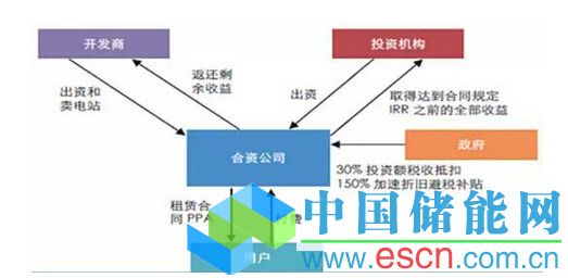 合資模式即開發(fā)商(Solarcity)和投資機構(gòu)共同出資成立合資公司,購買開發(fā)商建造的光伏電站,并與用戶簽訂PPA/租賃協(xié)議。投資收益由用戶電費或租金、稅收抵免、加速折舊避稅和電價補貼構(gòu)成。