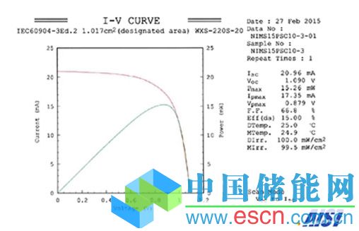 產(chǎn)業(yè)技術(shù)綜合研究所光伏發(fā)電研究中心評估及標準小組測量的鈣鈦礦太陽能電池的電流-電壓特性(出處:日本物質(zhì)材料研究機構(gòu))