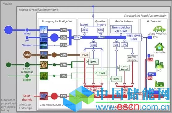 下圖為研究院給出的具體圖解,其中左邊藍(lán)色標(biāo)識代表能源來源為風(fēng)能、水力和太陽能,棕色代表廢料發(fā)電,綠色則代表生物質(zhì)能和沼氣發(fā)電。產(chǎn)生出的電能可分別供交通、住戶和商業(yè)樓宇以及工業(yè)使用。從圖表中還可以看出,城市能源(主要是分布式光伏)足以支撐30%供電需求以及31%的供熱需求。此外,法蘭克福周邊地區(qū)如萊茵-美因地區(qū)(50%)以及黑森地區(qū)(11.6%)可再生能源也將成為法蘭克福供電的主要來源。