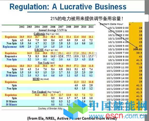 要滿足平衡電網(wǎng)的需求,調(diào)節(jié)備用容量在輔助服務(wù)市場將是收益非??捎^的一項(xiàng)服務(wù)。通常電力市場在調(diào)節(jié)備用容量服務(wù)上的支出比購買能源本身高很多,而且隨著更多新能源并入電網(wǎng),這種花費(fèi)將更加頻繁。艾拉舉例說,現(xiàn)如今備用容量市場已達(dá)到每千瓦時(shí)$0.21(每兆瓦時(shí)$209.02)。