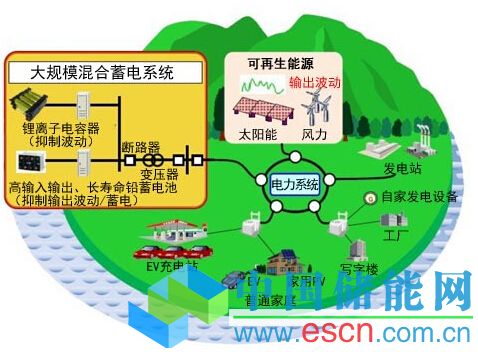 日立與新神戶電機從2011年開始,就一直在日本新能源產(chǎn)業(yè)技術綜合開發(fā)機構(NEDO)的補助事業(yè)“安全、低成本大規(guī)?;旌闲托铍娤到y(tǒng)技術開發(fā)”中,驗證“大規(guī)?;旌闲铍娤到y(tǒng)”。該系統(tǒng)協(xié)同控制鉛蓄電池和鋰離子電容器。結合使用有利錯峰和削峰的“高輸入輸出、長壽命鉛蓄電池”和可有效抑制電壓和頻率的短周期波動的“鋰離子電容器”,來優(yōu)化控制電流的輸入輸出。據(jù)稱由此可緩和輸出功率波動、充分利用剩余電力并使頻率穩(wěn)定。