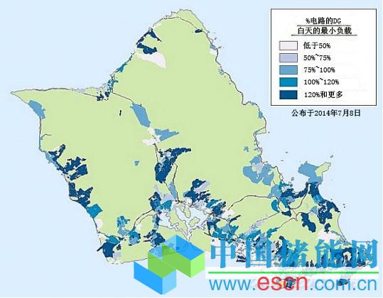 夏威夷電力擁有遍布瓦胡島的416條電路。在上個(gè)月,其中約20%的電路在白天的最低負(fù)載(DML)為120%多,如圖深藍(lán)色區(qū)域,因此,在那些服務(wù)區(qū)很少或沒有額外的光伏發(fā)電被接受。約23%的電路在75~120%的DML范圍內(nèi),合計(jì)占43%的HECO電路的總和。此外,光伏產(chǎn)能目前的水平對(duì)整個(gè)島電網(wǎng)的影響不只是特定的電路。非技術(shù)用語(yǔ)翻譯:近一半的夏威夷電力線路在網(wǎng)格設(shè)計(jì)和管理上都達(dá)到或超過(guò)了光伏滲透率的臨界點(diǎn)。這促使更嚴(yán)格的審查和討論了今天的電力基礎(chǔ)設(shè)施的實(shí)際和技術(shù)的限制去進(jìn)一步超越目前最大閥值。