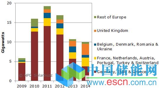 2012年,德國、意大利和希臘的光伏需求量占歐洲的71%,然而如今僅占到37%。NPDSolarbuzz分析師SusannevonAichberger表示:“2014年歐洲光伏需求量減少主要是受到了德國、意大利、希臘和羅馬尼亞補貼資金削減的影響。事實上,英國需要達到同比翻倍的預期才能使歐洲在2014年達到10GW的需求量。”