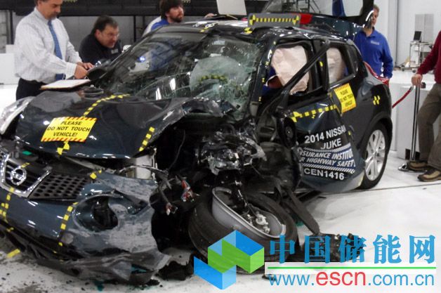 中國儲能網(wǎng)訊:300毫秒后,向前的動量停止了,安全氣囊打開,擠壓保護車內(nèi)的乘客,以減緩巨大沖擊對人體造成的傷害,同時乘車人都向著背離座位的方向運動。在撞到一塊灰色的厚鋼板之后,日產(chǎn)Juke整個左側(cè)前方的1/4處完全凹了進去;從側(cè)面看,在與灰色鋼板發(fā)生碰撞后,日產(chǎn)的整個左前角已向后傾斜。從側(cè)面瞄過去,青綠色的油漆讓經(jīng)過碰撞的Juke看起來和畫面定格的海浪沒什么兩樣。