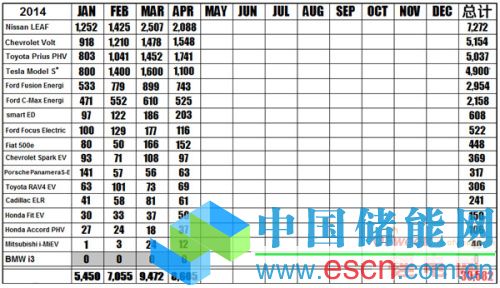 美國(guó)2014年1至4月電動(dòng)汽車銷量統(tǒng)計(jì)(單位:臺(tái))