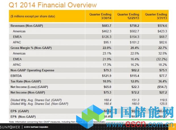 SunPower報告,2014年第一季度GAAP收入為6.924億美元,較前一季度6.381億美元有所提高。GAAP毛利率為23.5%,較2013年第四季度20.5%大幅提高。凈利潤為6500萬美元。