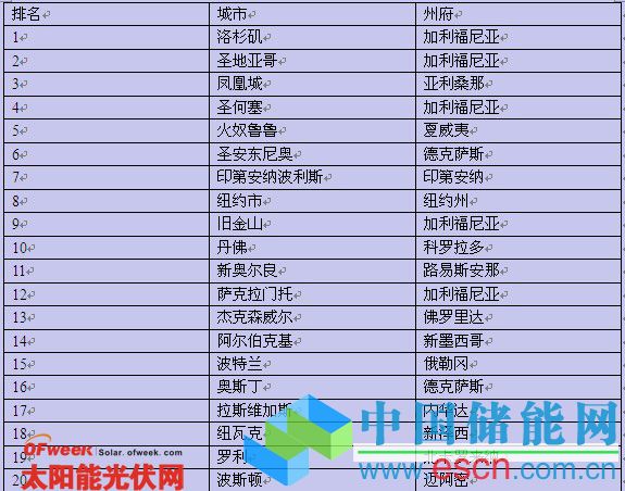 這份報告中還提到一些美國太陽能發(fā)電的一些數(shù)據(jù)。比如說,全美太陽能發(fā)電應(yīng)用城市20強(qiáng),收集了六年來美國主要太陽能發(fā)電應(yīng)用城市的裝機(jī)數(shù)據(jù)。其中,安裝量最高的5個城市(三個在加利福尼亞,以及火奴魯魯和鳳凰城)的安裝量數(shù)據(jù)最令人吃驚,這些安裝量最高的城市如印第安納波利斯、紐瓦克的數(shù)據(jù)代表了美國當(dāng)前太陽能發(fā)展的普遍現(xiàn)狀?! ?