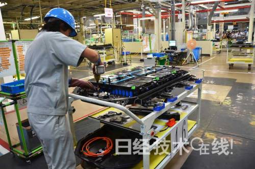 之后將車開到名古屋制作所內(nèi)的岡崎工廠中,更換作業(yè)在生產(chǎn)歐藍(lán)德PHEV時(shí)組裝電池的場(chǎng)所進(jìn)行。該場(chǎng)所目前處于未生產(chǎn)的空閑狀態(tài)。用升降臺(tái)將車輛抬起,每輛車輛主要由兩名作業(yè)人員從車輛下方擰開螺絲、拆下電池組。