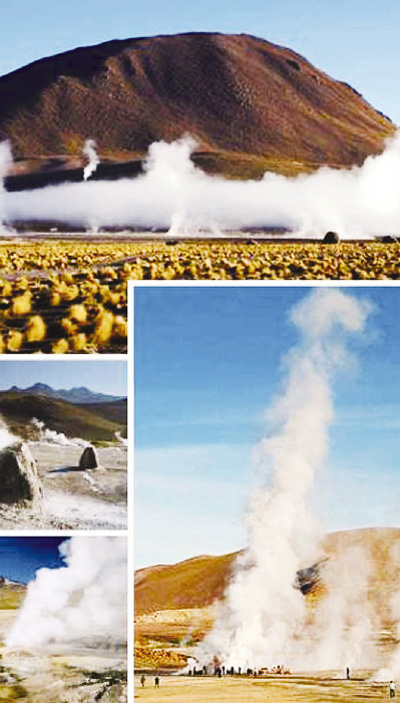 事實(shí)上,智利很早就開(kāi)始研究地?zé)衢_(kāi)發(fā)潛力,并于1907年在該國(guó)北部的地?zé)峁龋‥l Tatio)鉆得第一口勘探測(cè)試井,接著又在1931年相繼鉆得兩口井。地?zé)峁仁侨蜃罡叩拈g歇泉聚集地,高出海平面大約4200米,盡管地?zé)峁乳g歇泉的噴發(fā)高度很少超過(guò)幾英尺(蒸汽升騰的高度更高),但其產(chǎn)生的影響驚人,它形成了安第斯山脈的美麗背景,讓它看起來(lái)猶如另外一個(gè)世界。